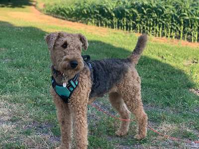 Pepper is a very kind and loving Airedale! Everyone who meets her loves her personality, and disposition. She loves to play with kids and other dogs, but also loves to cuddle. Her favorite activity is going to the farm to watch the animals - the chickens and goats are her favorite.