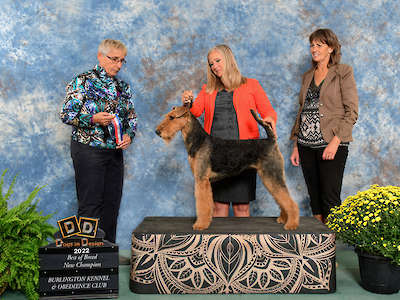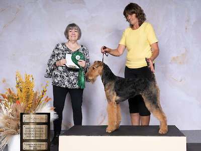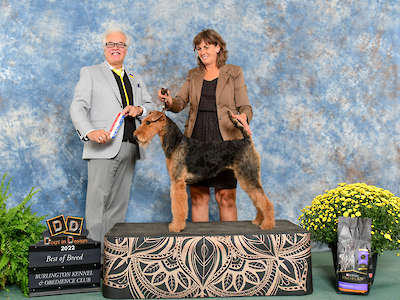 Willow is an amazing Airedale. She has wonderful conformation and movement. Finished her Canadian championship with multiple best of breed wins plus ATCC puppy sweeptakes win.